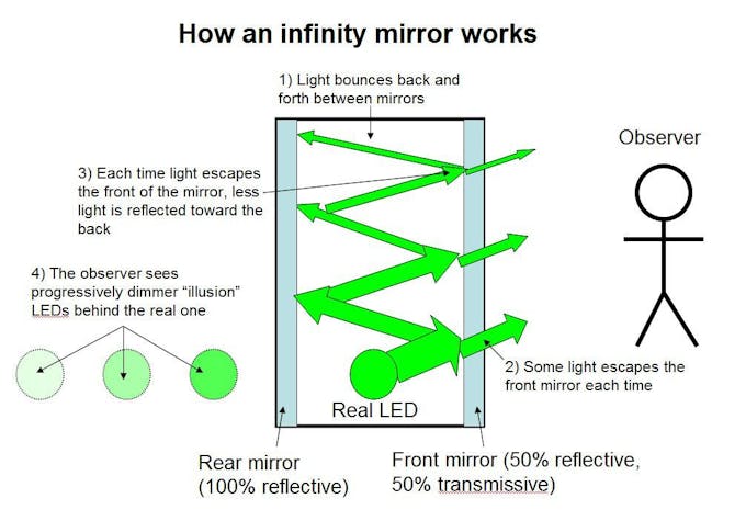 โปรดทราบว่าวิธีนี้ไม่สามารถใช้งานได้เนื่องจากสีของหน้าต่าง "ให้แสงผ่านไปในทิศทางเดียว" ซึ่งเป็นความเข้าใจผิดทั่วไปเพื่อให้ภาพมายาทำงานได้อย่างถูกต้องด้านข้างของกระจกเงาผู้สังเกตจะอยู่ข้างใน (โลกภายนอก) จะต้องเข้มกว่าด้านข้างด้วยไฟ LED (ภายในกระจกอินฟินิตี้) นี่เป็นผลเช่นเดียวกับที่คุณเห็นในภาพยนตร์อาชญากรรม / ภาพยนตร์ที่มีคนถูกคุมขังอยู่ในห้องสอบสวนซึ่งมีกระจกเงาอยู่บนผนัง แต่มีคนอยู่อีกฝั่งหนึ่งของกระจกสังเกตราวกับว่ามันเป็นแค่หน้าต่าง ที่ใช้งานได้ก็ต่อเมื่อห้องสอบสวนสว่างไสวขึ้นและห้องสังเกตการณ์มืด * เปอร์เซ็นต์ที่แน่นอนของการสะท้อนแสง / การแผ่รังสีอาจแตกต่างกันไปขึ้นอยู่กับชนิดที่คุณซื้อ - ระดับการสะท้อนแสงและความเร่าร้อนที่แตกต่างกันได้รับการควบคุมจริงในรัฐที่แตกต่างกันสำหรับใช้ในหน้าต่างรถยนต์ Google ถ้าคุณอยากรู้